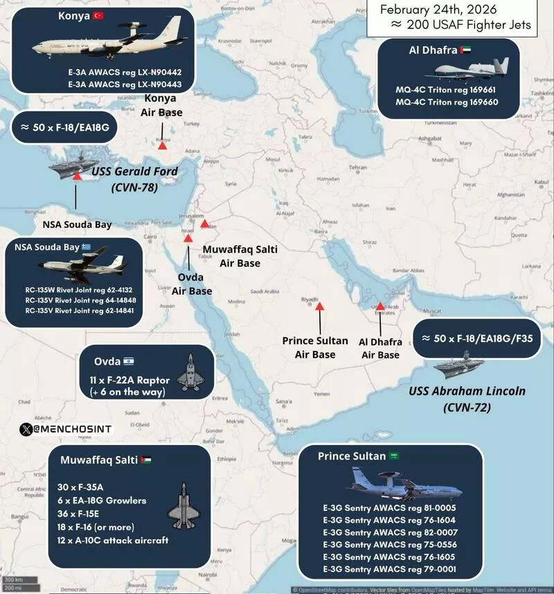 军事观察平台“WarMonitoring”制作一张目前美军部署分布,显示美军兵临伊朗城下。专家强调:“大规模的军事力量动员意味着川普的任何决定都是可行的”包括长期、高强度的军事行动,也可能包括有限的、针对性的打击。