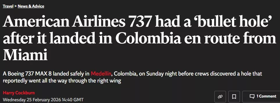 迈阿密/麦德林综合报道 — 一架 美国航空(American Airlines) 波音 737 MAX 8 客机在从哥伦比亚麦德林飞往美国佛罗里达州迈阿密的航班抵达后,被地勤人员在机翼上发现了疑似弹孔,目前正由哥伦比亚及美国当局展开调查。