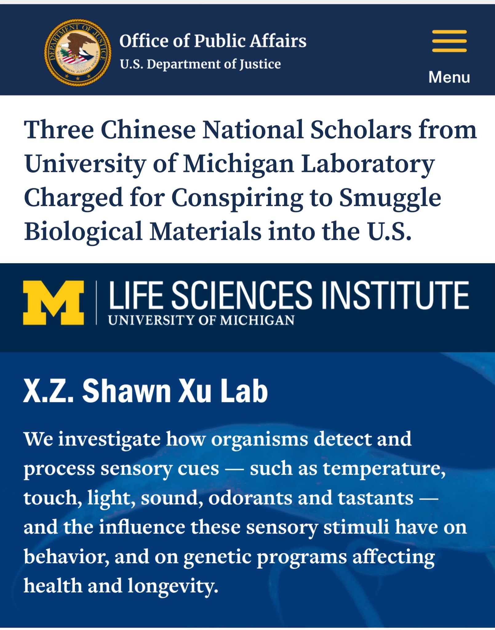 起诉书指白许及张峰帆在2024年及2025年间,多次收到从中国寄来、夹带隐藏生物材料的包裹,收件人是密西根大学一名中国籍女研究员,已于去年11月遭国土安全调查局(HSI)底特律办事处探员逮捕。