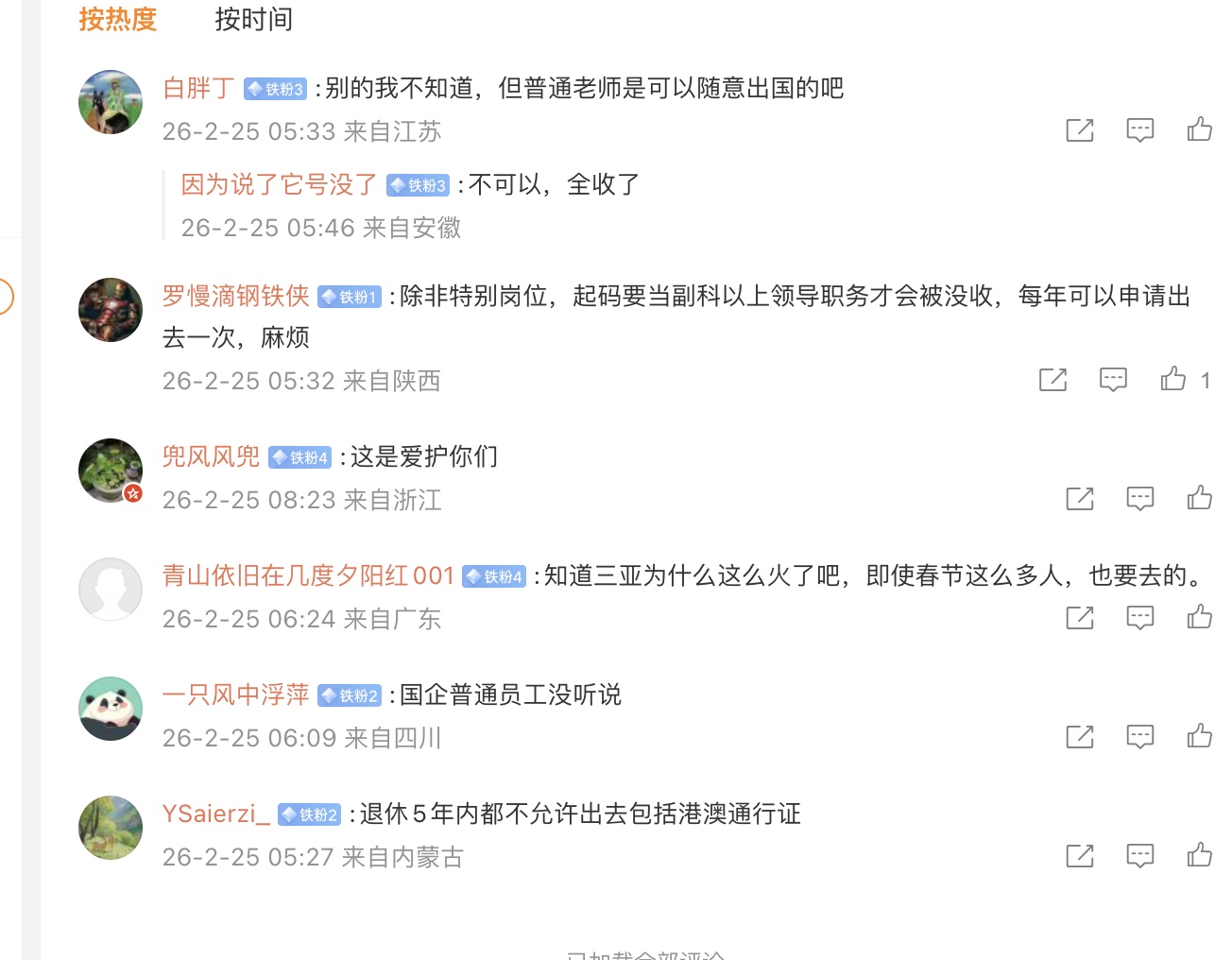 评论区有网友称,普通教师也不可以出国,护照全没收了,还有的说,“退休5年内都不允许出去包括港澳通行证”。