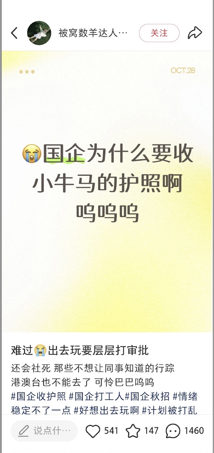 在社交媒体平台,近日有中共国企员工发帖称,“奉劝所有即将进国企还没进的朋友们,提前办护照,入职前办理”。