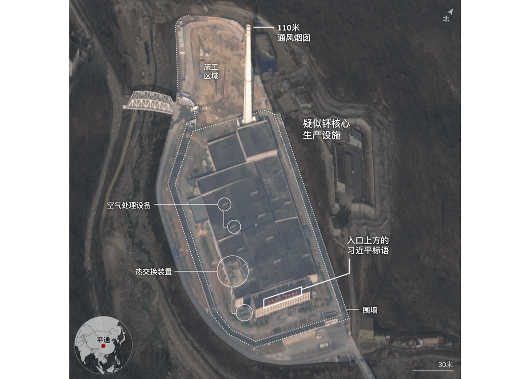 在一个叫平通的地方,山谷中还有一座被双层围栏包围的设施。专家认为,中国可能在那里制造装填钚的核弹头核心。该设施的主体建筑以一座约110米的通风烟囱为标志,近年来这里进行了翻修,加装了新的通风口和散热装置。旁边还有新的建筑工程正在进行。