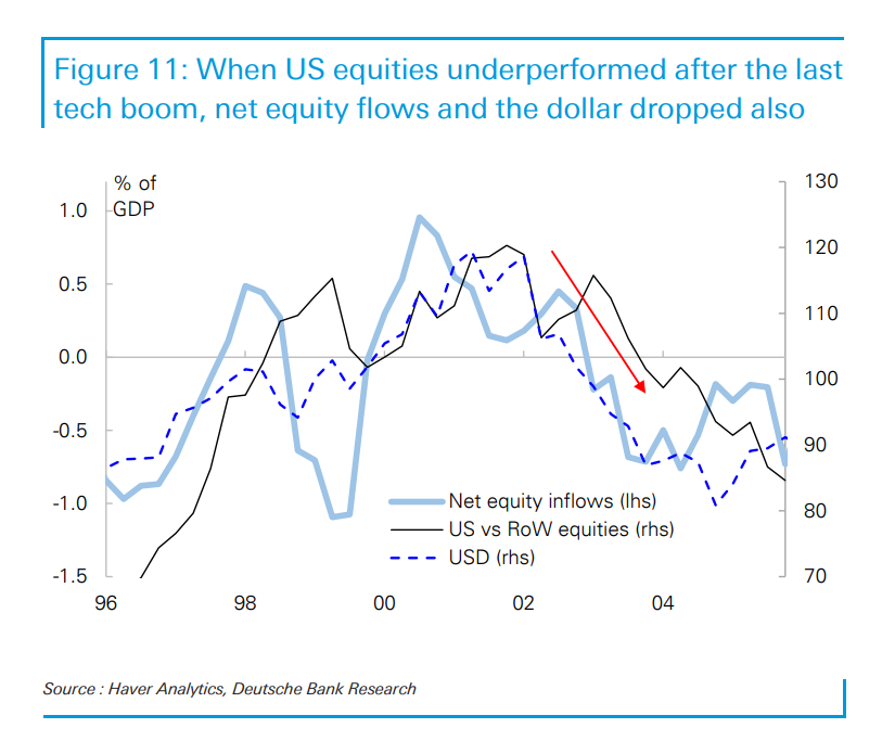 把时钟拨回上世纪90年代末。在科技股繁荣与破裂的周期之后,从2002年开始,美国股市开始大幅跑输全球。随之而来的是,美国的股票净流入资金急剧翻转为负值,美元顺势开启了长达数年的贬值周期。