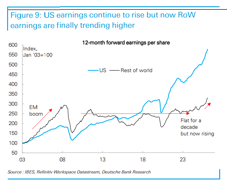 资本的转移需要一个核心前提:非美市场(RoW)必须有能力至少跟上美股的步伐。在德银看来,这个前提现在不仅成立,而且非常合理。