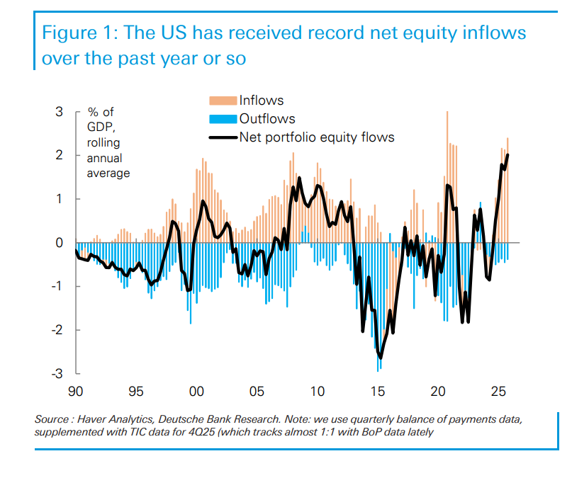 德银称,2025年美股获得相当于GDP约2%的创纪录资金流入,但却跑输全球创下15年来最差相对表现。随着估值溢价仍高、非美盈利动能回升,海外资金可能重新评估对美股超配;若资金净流入降温甚至反转,美元或面临类似2000年代初科技泡沫破裂后的下行压力。
