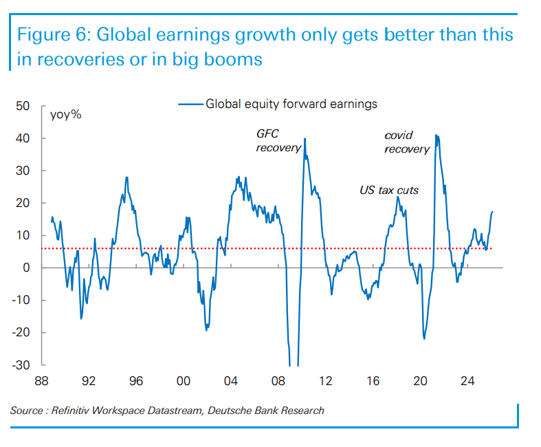 “全球企业盈利正以15%以上的速度增长。这并非史无前例,但通常只发生在经济衰退后的复苏期(如2010年、2021年),或特殊宏观节点(如2017年美国减税、2000年代新兴市场繁荣期)。”