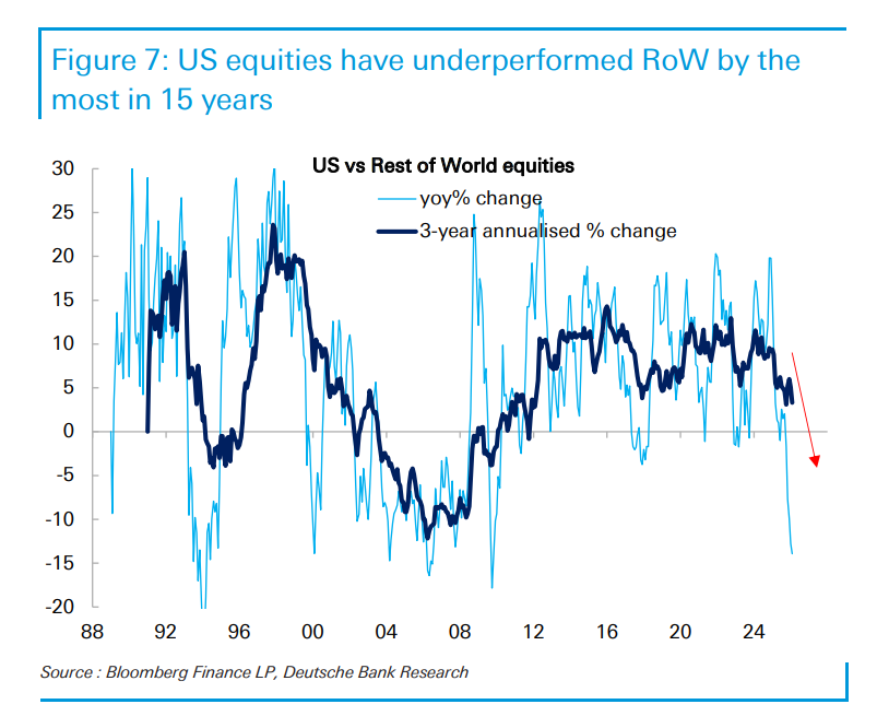 在德银看来,关键不只是股市排名变化,而是它可能触发一个更大的链条:海外投资者对美股超配的“信念”是否会动摇,以及这种动摇会不会把资金从“买美股、配美元”的惯性里抽离出来。