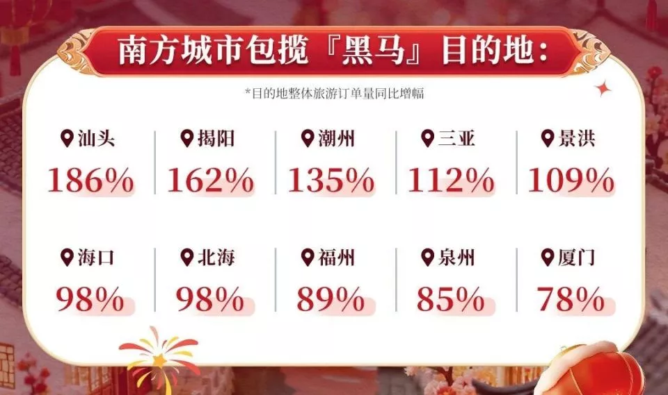 携程发布的《2026马年春节旅游市场预测》显示,汕头、揭阳、潮州等南方城市春节预订量同比涨幅均超过100%;