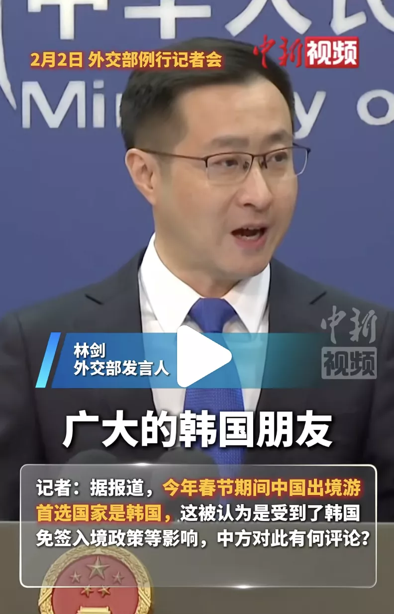 2月2日外交部例行记者会上,有记者提出今年春节期间,中国人出境游首选是韩国。外交部发言人林剑顺势邀请广大韩国朋友来华过年。
