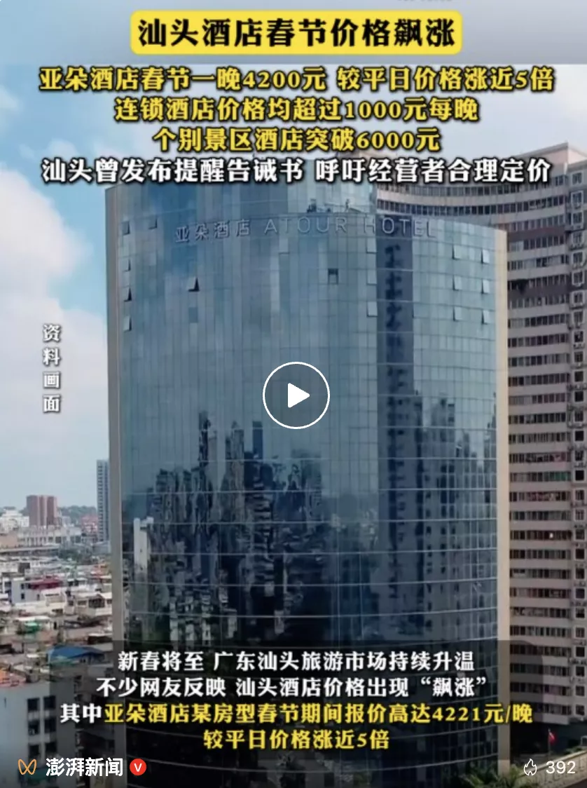 汕头部分酒店价格已超上海外滩,其中亚朵酒店某房型春节期间报价高达4221元/晚,较平日价格涨近5倍。