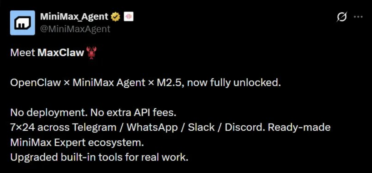 2月26日,Minimax 上线了基于 OpenClaw(龙虾) 构建的云端 AI 助手——MaxClaw。
