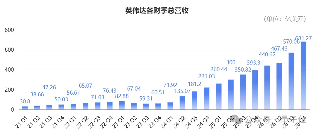 2026财年(即2025年)第四季度,公司营业收入为681亿美元(约4678亿元),同比增长73%,环比增长20%。