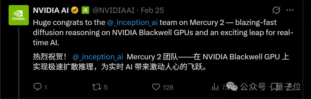 消息一出,英伟达第一时间跑来祝贺了(当然也可能是因为它投了Mercury 2背后的公司):
