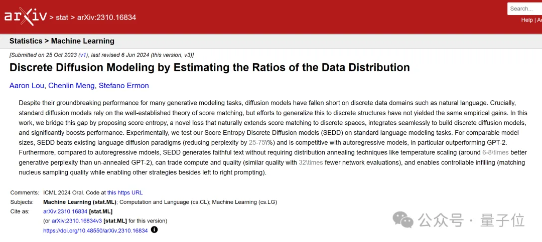 于是在2023年,他和团队发表了一篇关键性论文《Discrete Diffusion Modeling by Estimating the Ratios of the Data Distribution》,里面介绍了一种名为Score Entropy Discrete Diffusion models(SEDD)的模型。