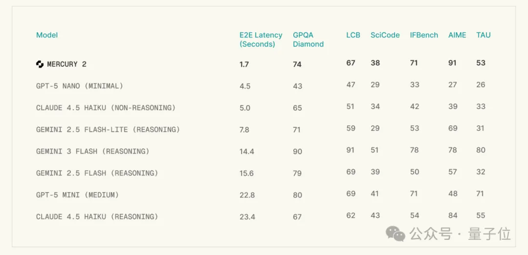 延迟低至1.7s的情况下,在GPQA(科学问答)、LCB(编程)、AIME(数学)等多个基准测试中,Mercury 2的得分普遍高于或持平于那些速度较慢的“小型/轻量级”模型(如GPT-5 Nano, Claude 4.5 Haiku)。