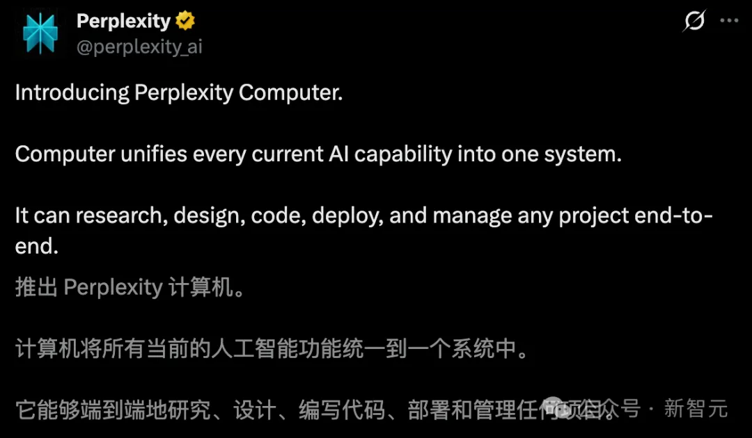 今天,Perplexity重磅发布「Perplexity Computer」,一键将全球最强AI装进入一个系统。