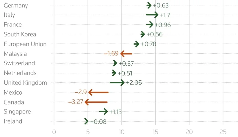 各经济体在特朗普原关税体系与新15%统一关税下的税率变化。路透社制图