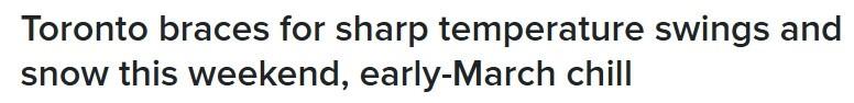 据680 NewsRadio气象专家Denise Andreacchi表示,周五短暂回暖后,3月初将迅速迎来严寒天气,大多伦多地区(GTA)将出现小雪、白天气温持续低于零度,以及体感温度更接近隆冬水平。在经历了一周多变天气之后,多伦多将在周五迎来短暂缓解,白天气温将升至约5°C。