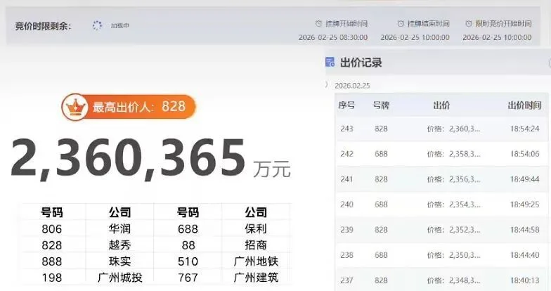 竞拍开始,前100轮还算“温和”,但当总价飙到213亿元时,只剩下了保利和越秀“神仙打架”,每一轮加价2000万,9个小时,243轮,平均每2分钟一次出价。最终呢?越秀地产以236.04亿元胜出,溢价率26.6%,住宅可售楼面价干到8.58万元/㎡。