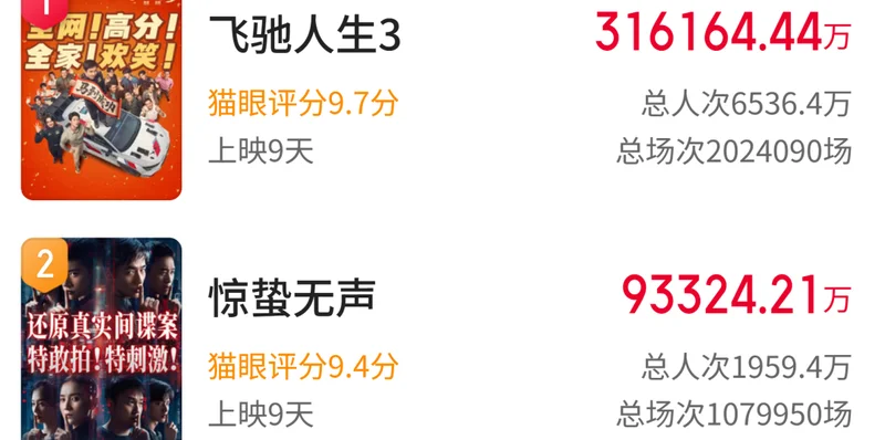 他导演的《飞驰人生3》,已经成了春节档最大的赢家,以超过32亿元的票房位列冠军(截止2月25日),观影人次突破6500万,远多于第二名《惊蛰无声》,形成了断档式领先,虽然战事目前尚未结束,但韩寒的胜利已经没有悬念了。