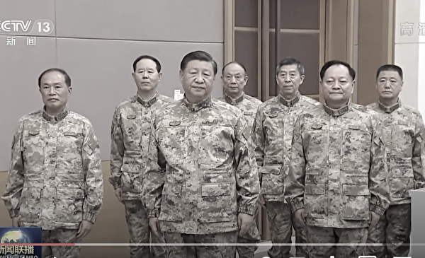 中共官媒报道,习近平2022年11月8日赴军委联合作战指挥中心,从左到右:何卫东、刘振立、习近平、张升民、李尚福、张又侠、苗华。(视频截图)