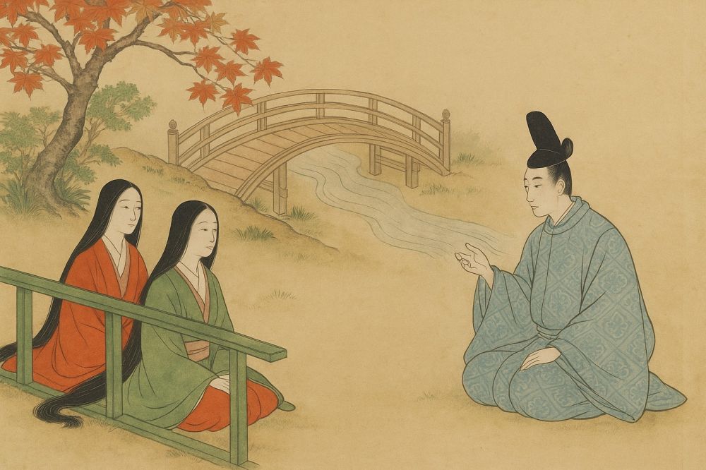 行近宇治山庄,忽闻弹琴凄凉之声。薰君仔细辨听,这是琵琶之声,曲调是黄钟。正思躲藏细听,他身上的香气却早就引人注意。