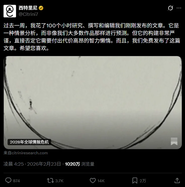前几天,美国的独立金融研究机构 CitriniResearch 发布了一篇《 2028 年全球智能危机 》 报告。