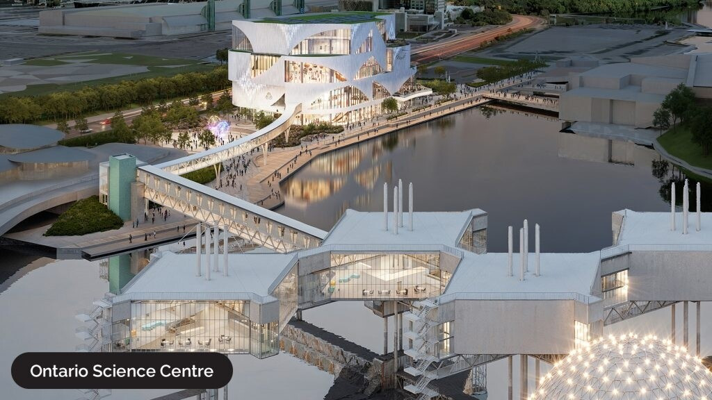 该科学中心的设计和建设合约总价值为10.4亿加元,由Ontario Science Partners负责,这是一个合作团队,其中包括Hariri Pantarini Architects建筑事务所,该公司曾参与设计安省Stratford的Tom Patterson Theatre剧院。该团队还将负责为项目提供融资并进行后期维护。公布的设计效果图显示,新科学中心将是一座充满未来感的建筑,拥有大面积玻璃窗、绿色屋顶、多层开放空间,一条高架步道将主建筑与各个展馆连接起来,建筑前方还将设有一条沿湖的木板步道,供公众步行。