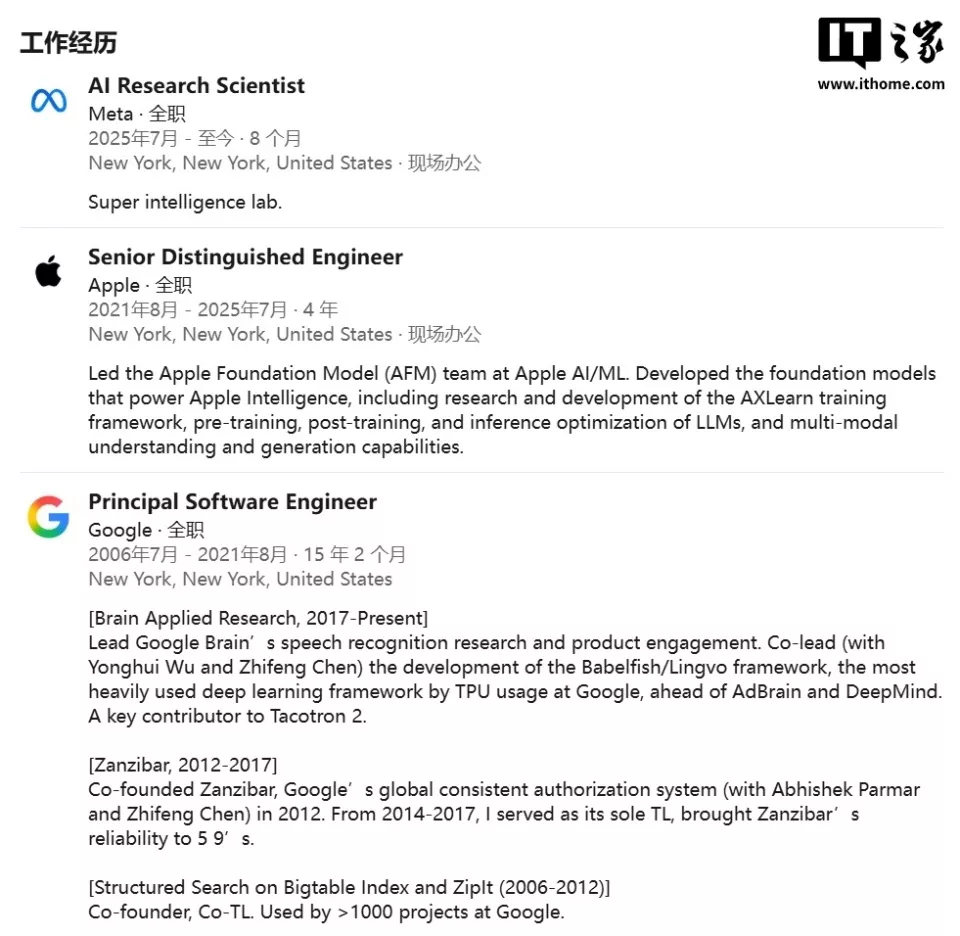 庞若鸣曾是苹果基础模型团队(Foundation Models,简称 AFM)的核心负责人,在苹果领导着一支约 100人的团队,负责开发大型语言模型(LLMs),而这些模型构成了 Apple Intelligence 和其他 AI 功能的基石。