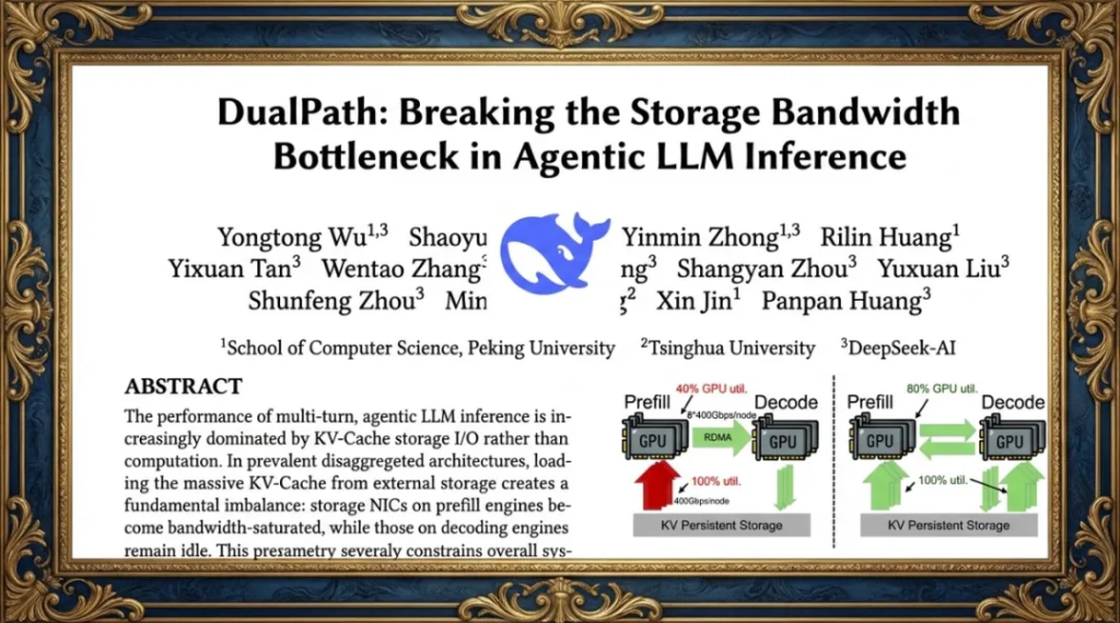 论文提出推理系统DualPath,针对Agentic大模型场景中KV-Cache读取造成的I/O带宽瓶颈,创新性地开辟"存储→解码→预填充"双路径加载机制,充分利用解码节点闲置存储带宽。系统通过QoS流量隔离与自适应调度,在1152张GPU集群上验证,将离线推理吞吐量最高提升1.87倍,在线服务吞吐量平均提升1.96倍。