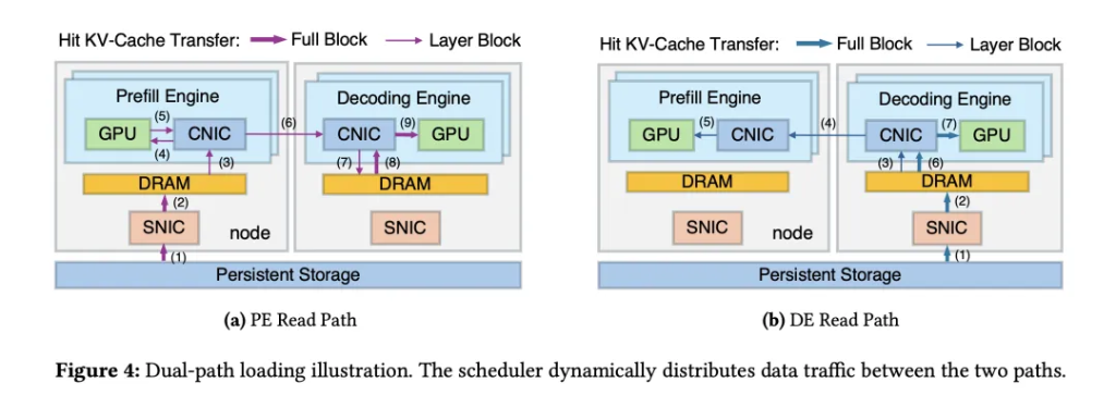 1.预填充读取路径:KV-Cache从持久化存储读入预填充节点的内存缓冲,再传输到GPU显存进行计算,最后把完整的KV-Cache传给解码节点。
