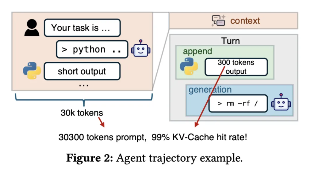 在典型的智能体轨迹中,模型会接收一段包含先前上下文和新追加Token的提示词,然后生成下一步动作。