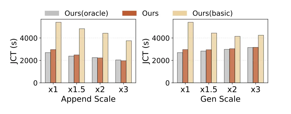 随着每轮追加Token长度的增加或生成长度的变化,DualPath依然能够保持稳定的性能提升,证明其成功消除了存储网络瓶颈。