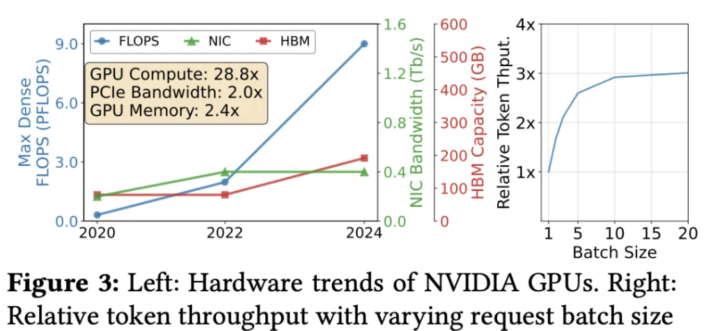 此外,硬件的发展趋势也加剧了这一矛盾。从图3左侧的NVIDIA硬件演进路线可以看出,GPU的计算力(FLOPS)增长速度远远甩开了网络带宽和显存容量的增长,导致计算与I/O的比例严重失衡。
