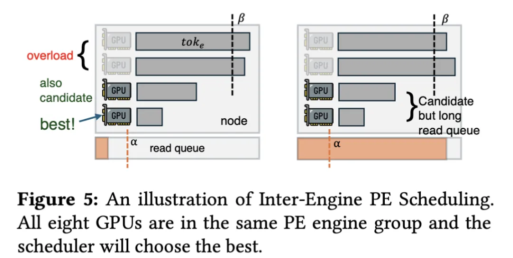 DualPath引入了自适应请求调度器(工作原理如图5所示)。该调度器不仅会监控各个节点的磁盘读取队列长度,还会将Token数量作为衡量负载的核心指标。系统将计算节点划分为过载、低读取队列和高读取队列三类,优先将新任务分配给读取队列较短且未过载的节点。