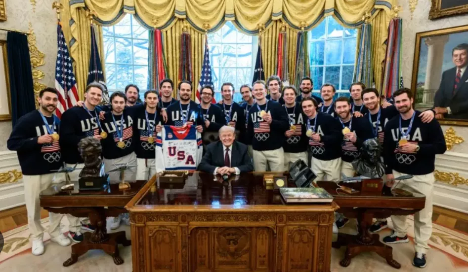 2月24日,总统川普(Donald Trump)在白宫接见了刚刚在2026冬季奥运会上夺得金牌的美国男子冰球队。