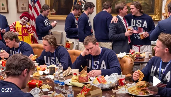 然而,当现场画面流出后,美国社交媒体的关注焦点却迅速偏离了金牌本身——因为摆在球员面前的,并不是传统意义上的白宫宴席,而是一整排来自McDonald's的汉堡、薯条和炸鸡。