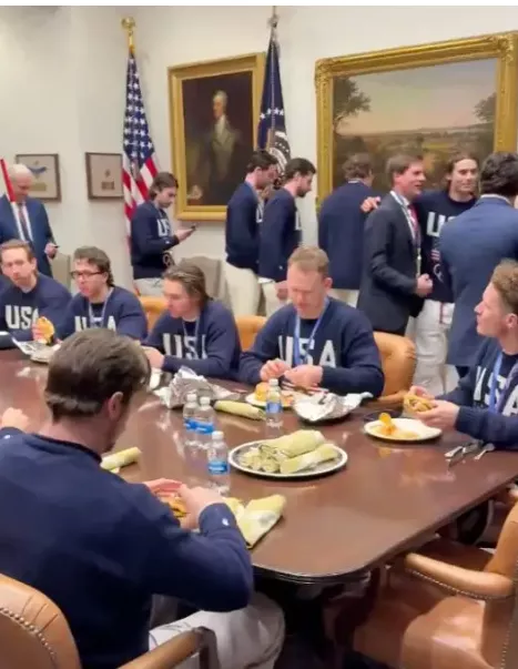 当天的视频显示,美国男子冰球队队员们在播放着爱国歌曲的背景音乐中用餐,有人举着汉堡聊天,有人边吃边拍照留念,整体气氛远比传统国宴轻松许多。