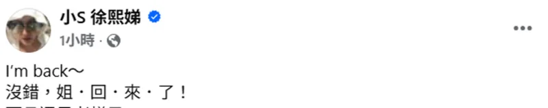 小S发文:姐回来了素素娱乐