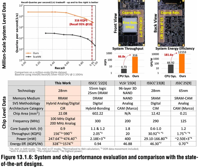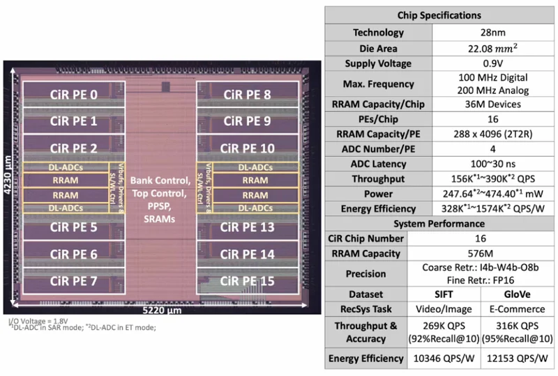 这款36M RRAM CiR芯片能实现390K QPS的吞吐率与1574K QPS/W能效比。其构建的多芯片系统可实现百万级实时端到端推荐系统(RecSys)。