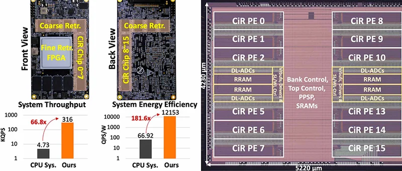 在实际推荐系统任务中,CiR通过扩展至576M规模的多芯片系统,QPS提升了66倍,QPS/W提升181倍,准确率与CPU相当。