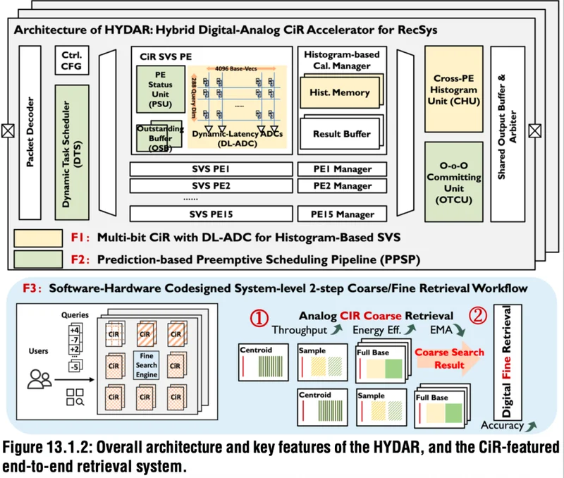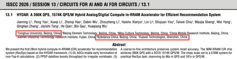 2月26日消息,2月15日-19日,在被业界誉为“芯片设计国际奥林匹克会议”的国际固态电路大会(ISSCC 2026)上,清华大学、华为、字节跳动等大学与公司的研究人员发表论文,首次提出一款基于HYDAR框架的28nm混合存内计算(CiR)芯片的推荐系统(RecSys)加速器。