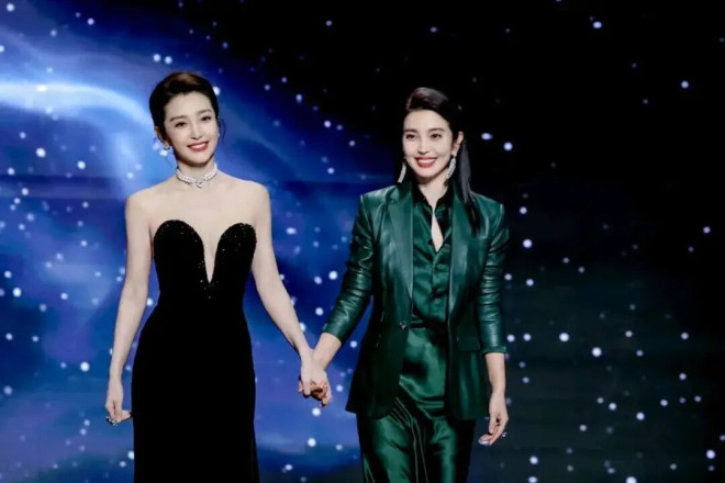 李冰冰身着阿玛尼高定黑丝绒抹胸长裙,妹妹李雪全套复古绿硬朗西装亮相。