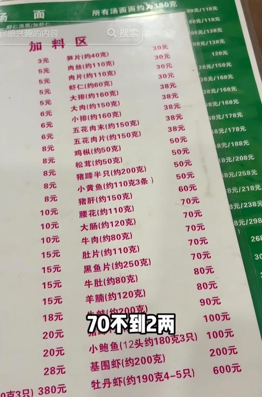 而且598元一碗的面还不是豪华版,还能额外加料。如果加个肉、添个虾,价格又得往上翻,随便加加就又是大几百。