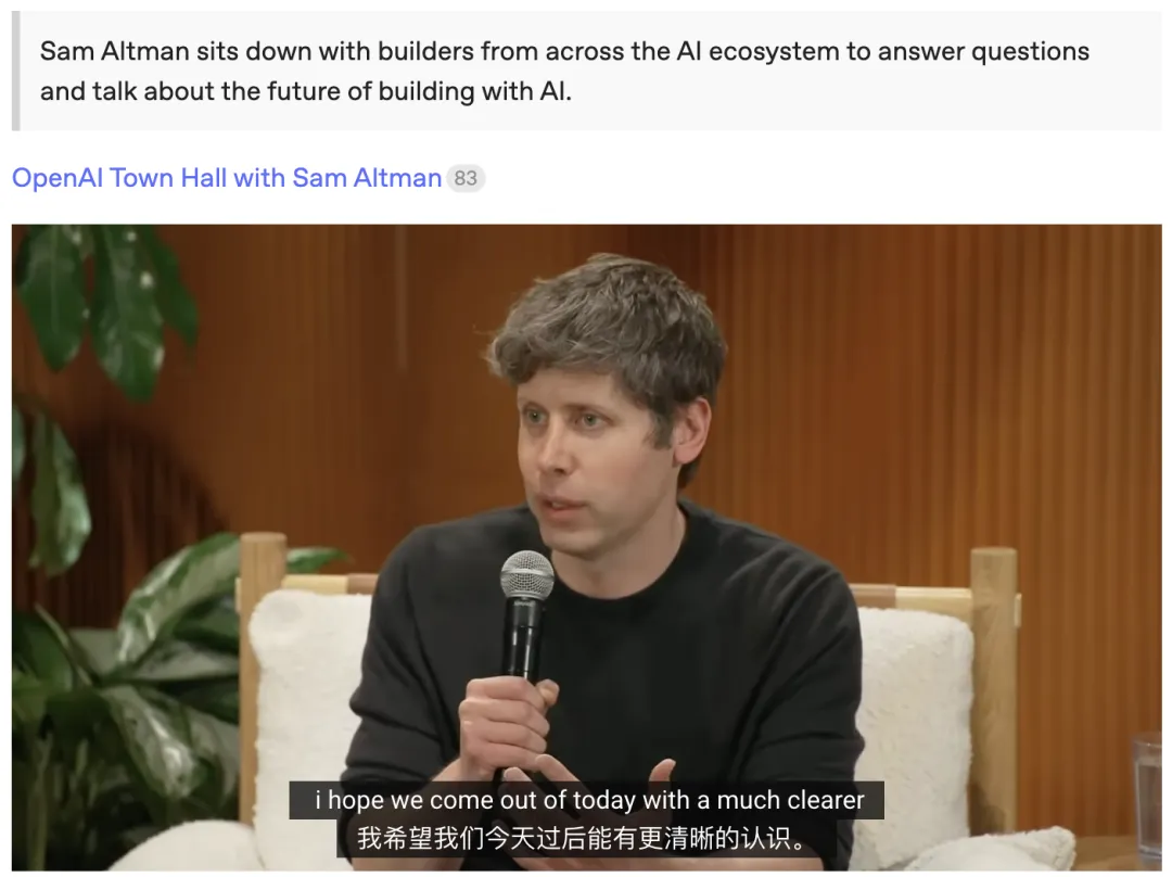 1月26日,萨姆·阿尔特曼(Sam Altman)在市政厅会议(Town Hall)中深入探讨了 AI 的未来、工程范式转移、教育变革以及社会影响。在现代企业中,“市政厅会议”往往是CEO 或高管面对全体员工(可线下可线上),通报战略并回答提问,这种做法可以拆除层级壁垒的直面沟通。这次在Sam Altman四周散坐着的,既有很多年轻的创业者、AI应用开发者、科学家,也有大一新生。