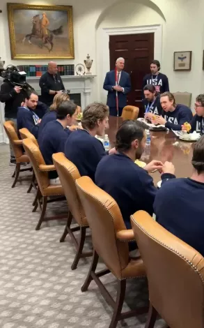 当天的视频显示,美国男子冰球队队员们在播放着爱国歌曲的背景音乐中用餐,有人举着汉堡聊天,有人边吃边拍照留念,整体气氛远比传统国宴轻松许多。