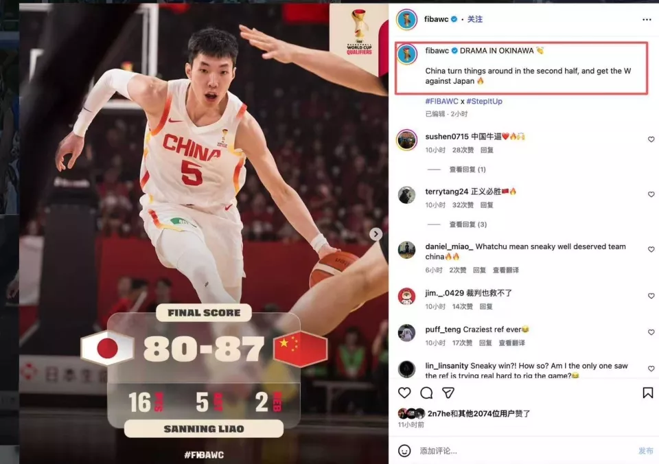 FIBA世界杯官方账号在报道这场比赛的比分时写道:”China with a sneaky win over Japan”,翻译过来就是“中国队‘侥幸’战胜了日本队。”