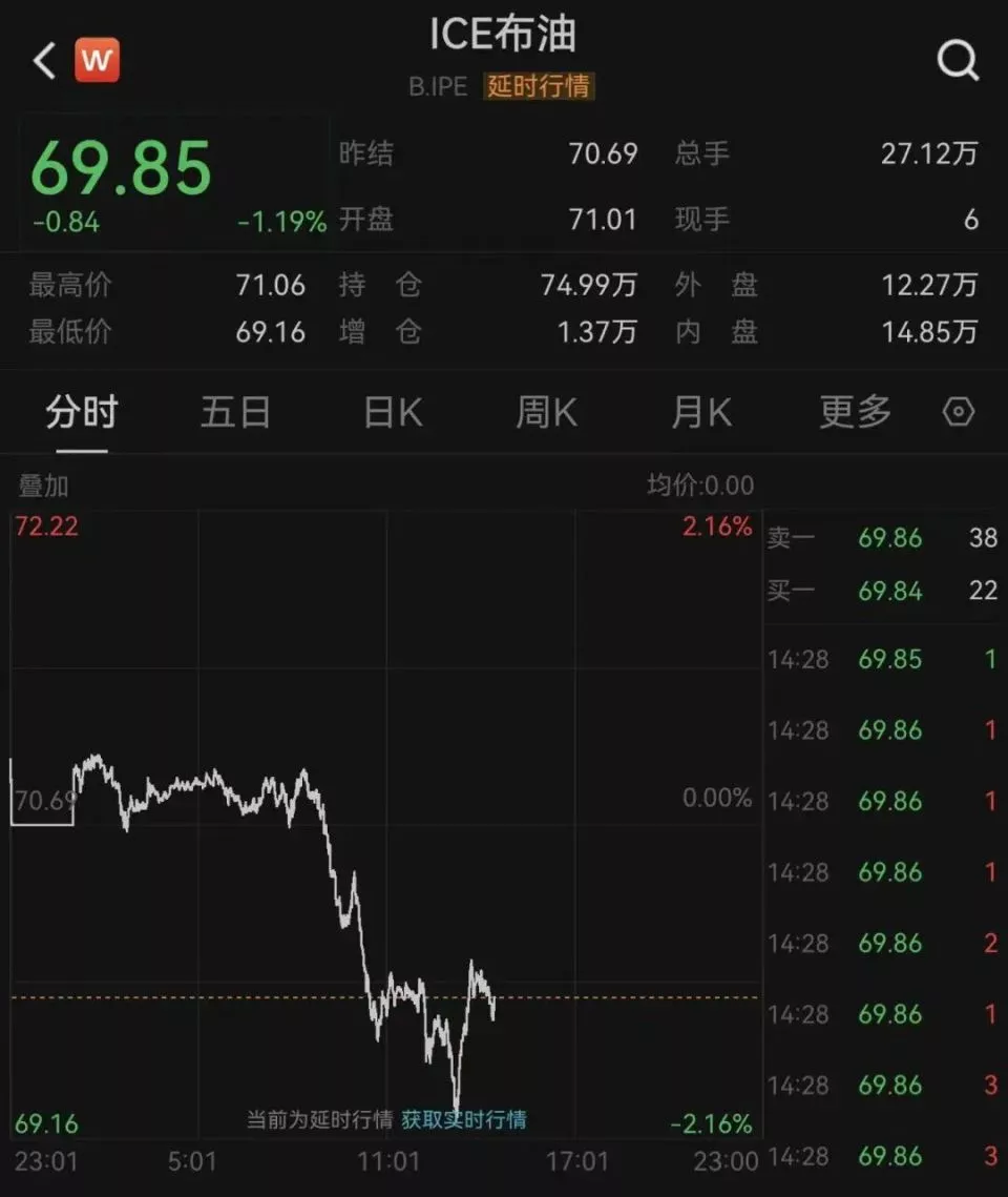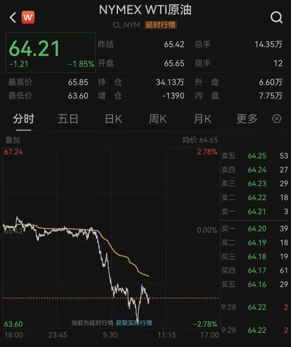 WTI原油一度跌近3%,布伦特原油一度跌超2%。
