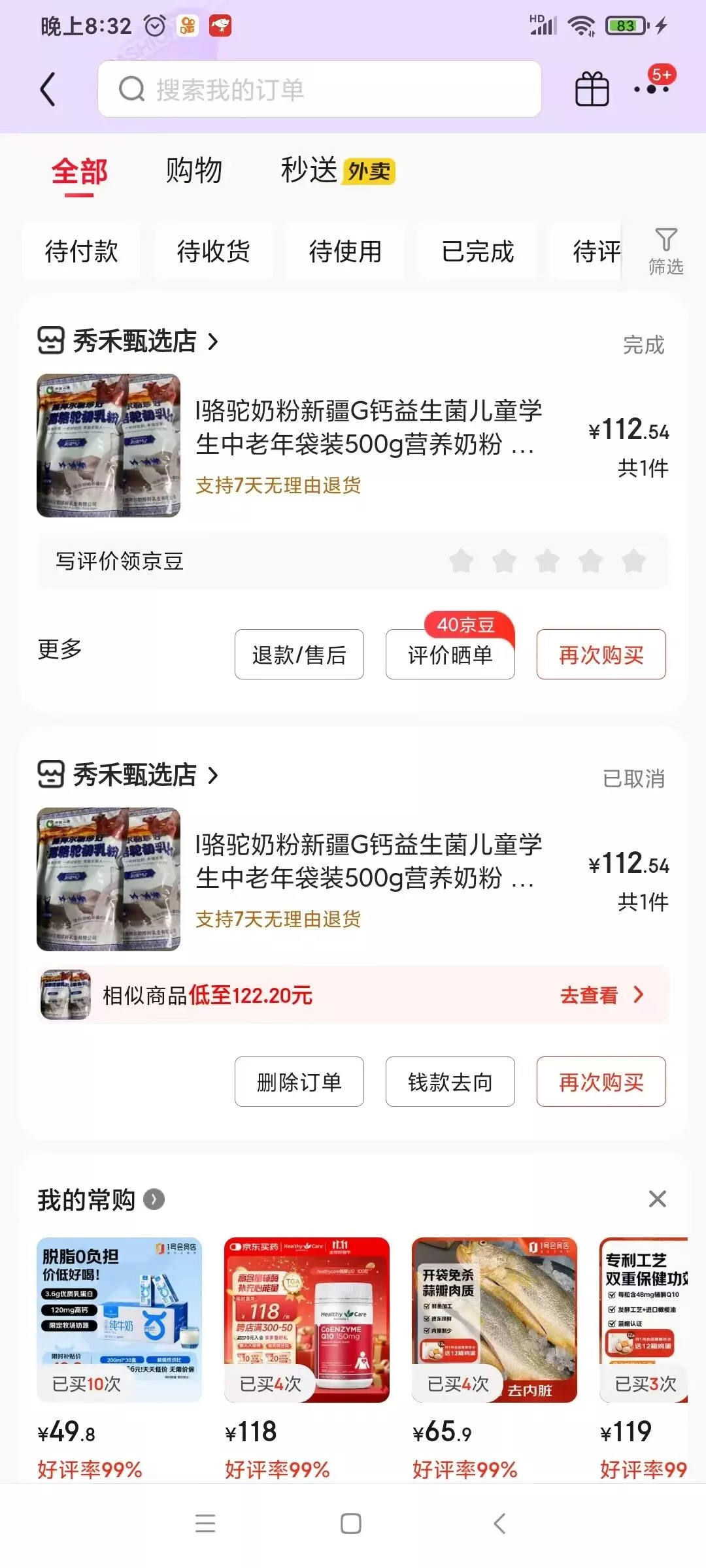老程也相当不信邪。既然你说没有订单不能处理,我就下一个订单呗。于是,10月17日,他根据搜索推荐结果,在京东平台秀禾甄选店下单,买了5袋驼奶粉,每袋500g,标价117元,实际支付112.54元。