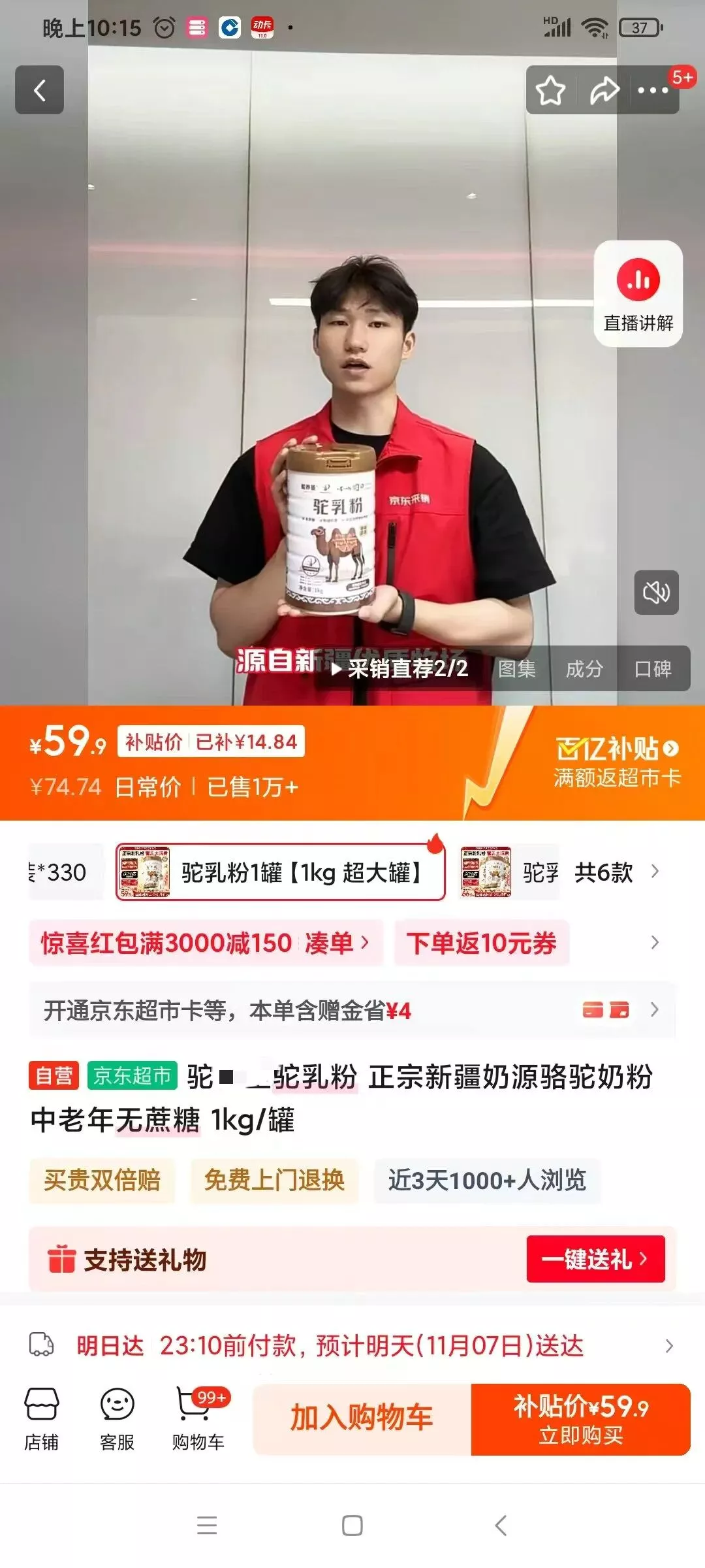 老程也随机看了,他注意到一款带有“京东超市”“自营”标识的“驼**驼乳粉”链接(除了代言人,一个穿着“京东采销”服装的工作人员为其做推广视频),销量很大,也随机下单了一款细看。到手后发现,这款2025年3月14日生产的产品,标注的产品类型为“特殊膳食食品(运动营养食品-补充能量类)”,执行的标准是GB24154。